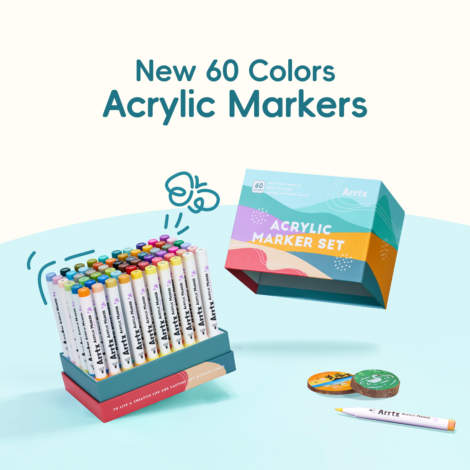 For best performance, recap after each use and store with the nib pointing downward to maintain optimal ink flow. In the box, you’ll find all 60 brush markers arranged in the organizer base so you can sort, pick, and replace colors quickly during a session.