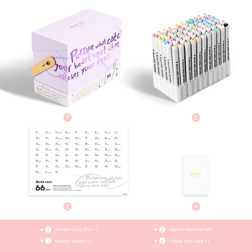 Our alcohol-based markers come enclosed in an exquisite gift bag featuring 66 wells. Additionally, the top cover of the box serves a dual purpose, functioning as a stand to keep your markers neatly organized.