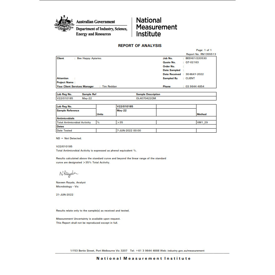 Exceptional Potency – Independently tested and awarded TA35+ for batch (V22/010185), the highest antimicrobial rating by the National Measurement Institute of Australia.