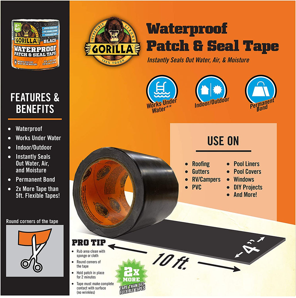 Gorilla Waterproof Patch & Seal Tape instantly seals out water, air and moisture. With an extra thick adhesive layer and UV resistant backing, this flexible tape conforms to form a permanent bond indoors and out. At 4 inches wide use it to patch holes, s, gaps and tears, even underwater. Excellent for Home, auto, marine, camping, RVs, outdoors and more. Will work on plastic, metal, aluminum, rubber, wood, vinyl, glass, steel, acrylic and much more. Gorilla Waterproof Patch & Seal Tape can be applied in hot, cold, wet and dry conditions.