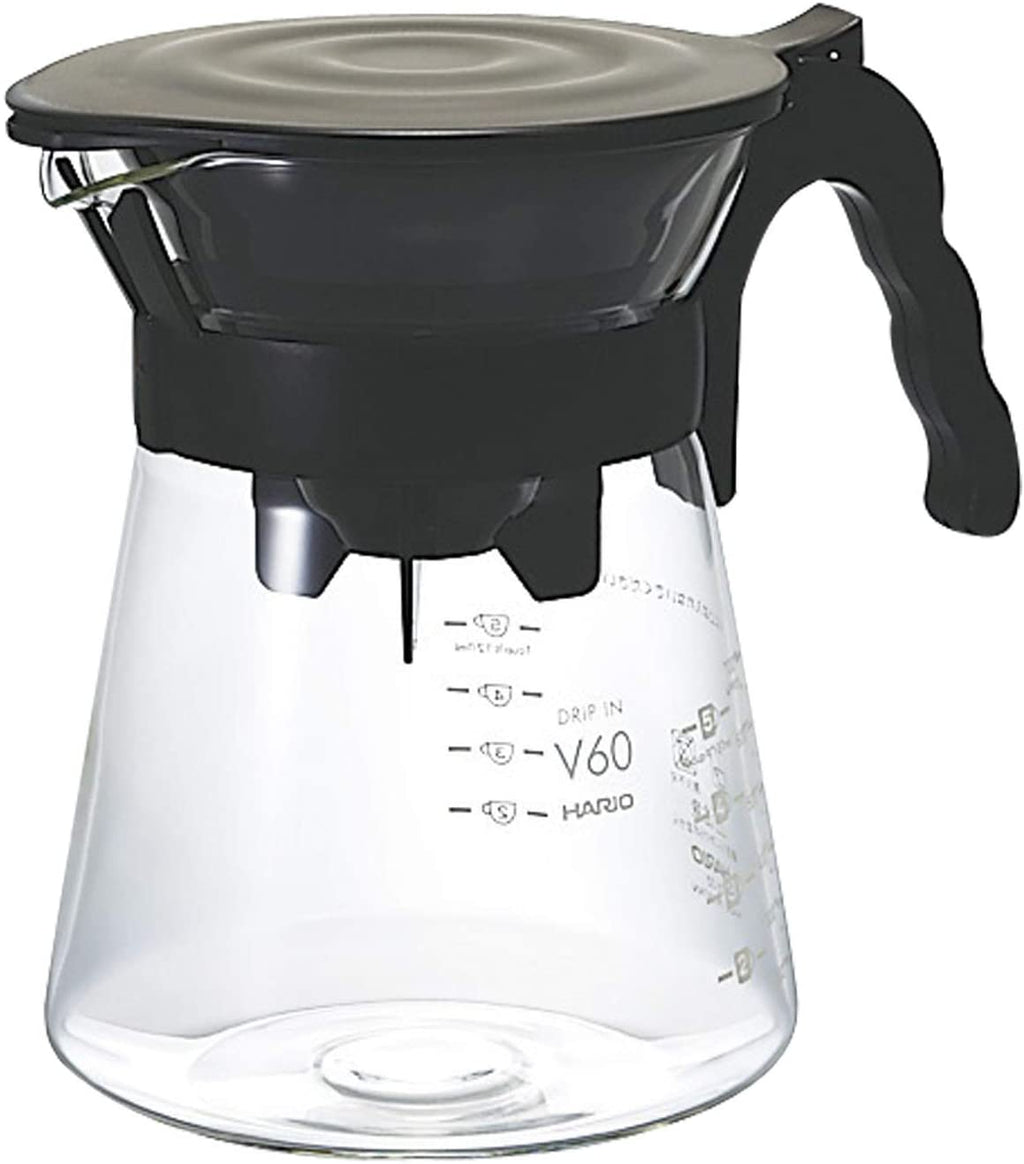 The Hario v60 drip-in server provides a smart way to start brewing outstanding drip-style coffee at home. Made of borosilicate glass, the carafe has 700ml capacity for 1 to 4 people. This coffeemaker has everything you need to start brewing right away.