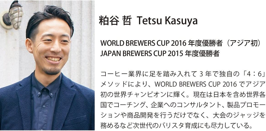 The iconic Hario V60 series proudly presents a customized model created in collaboration with Mr. Tetsu Kasuya, the winner of the 2016 World Barista Championship. This "Kasuya Model" is designed to extract the best with Mr.Kasuya's winning method, "4:6 method."