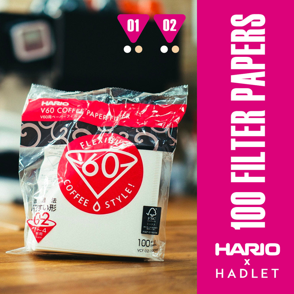 Cone-shaped white/natural paper filter for Hario's V60 size 01/02 pour-over brewers. Contains 100 disposable 01/02 paper filters. These paper filters produce a clean, flavorful, sediment-free cup. Hario's paper filters make for convenient brewing and cleanup.