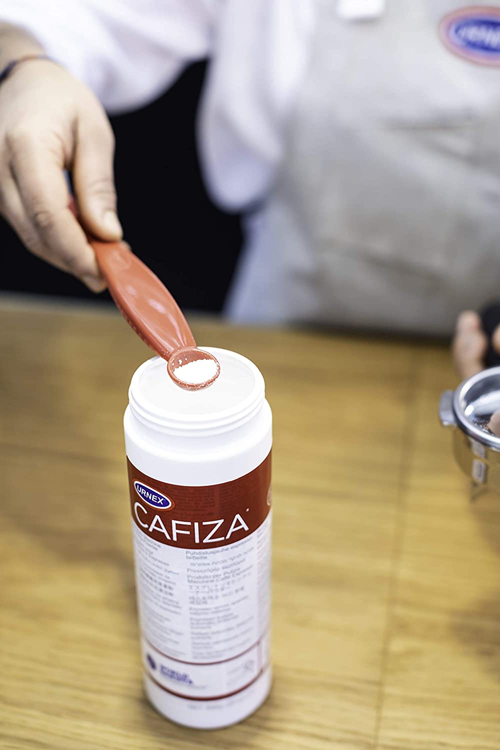 1. Insert blind filter in portafilter and add up to 1/2 teaspoon (3 g) of Cafiza Powder.