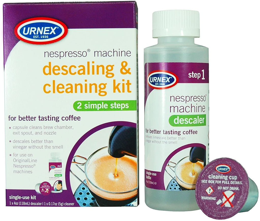 The Urnex Nespresso Descaling and Cleaning Kit is a two-step cleaning kit designed to work with all Original Line Nespresso machines. The cleaning capsule removes stale coffee oil residue from the brew chamber, exit spout and nozzle. The descaling liquid removes mineral build up from the heating element in your machine. Cleaning and descaling your Nespresso machine regularly will ensure your coffee tastes better and your machine lasts longer.